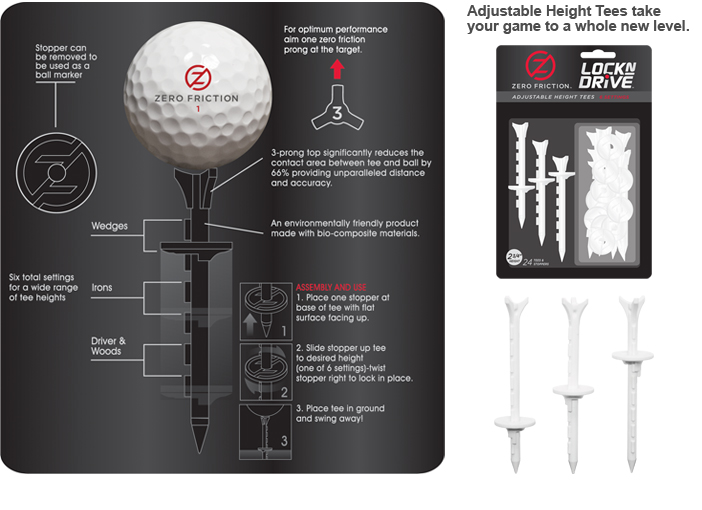 The Zero Friction Lock n Drive™ is a unique tee system that allows you to place your tee at the same consistent height every time, and is complete with Zero Friction’s™ patented 3-prong design. This allows for the Lock n Drive™ to deliver accuracy in height and at impact every time.