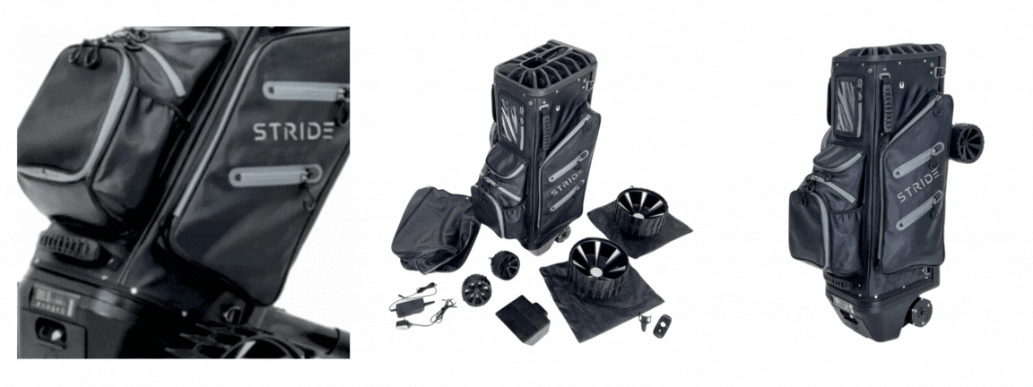 The wheels can be easily removed in seconds allowing the bag to fit nicely on the back of a golf cart. The STRIDE includes a rechargeable battery and has a built-in intelligent gyroscope control system for stability, speed control, soft start, and automatic stop.