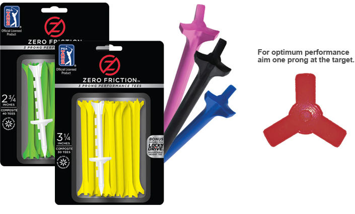 The Zero Friction™ Tee, is the original performance tee. Its patented 3-prong top significantly reduces the contact area by 66% leading to longer, straighter drives. Rated longest, most accurate tee in independent laboratory tests, offering 7 feet less dispersion (50%) and 5 yards longer than conventional wood tees. Every Zero Friction package comes with a Bonus Lock n Drive™ tee.